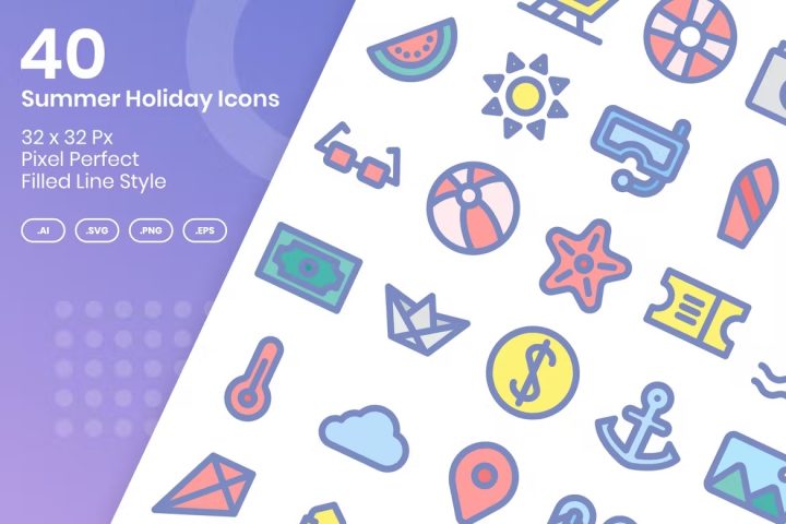 Vector, Filled, Line, Summer ,Holiday, Season, Trip, Vacation, Travel, Beach, Hotel, Sun ,Sunny, Sea ,Flight, gfx