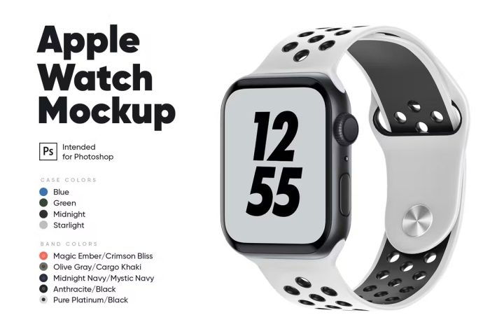 Create an elegant presentation for your designs with this fully customizable Apple Watch 7 with Sport Band . Includes smart-objects and masks, allowing you easily add your design and lets you change the color for most scene objects.