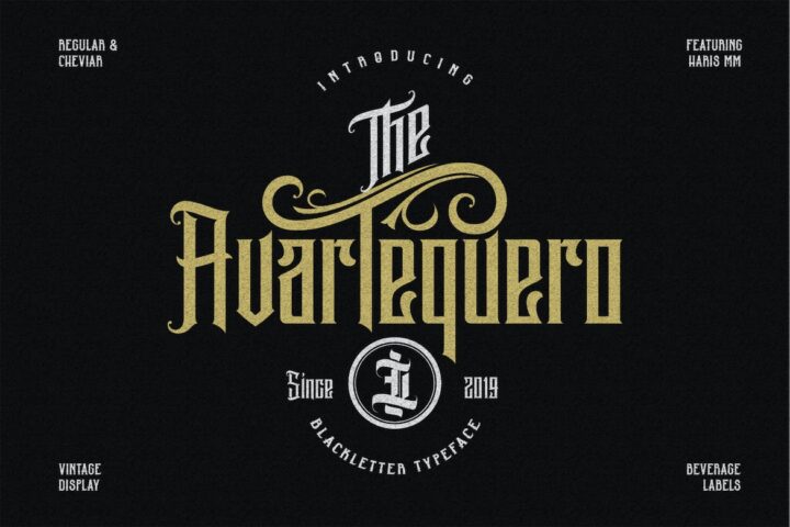 With vintage style Avartequero is very suitable as to make a design choice for Vintage Beverage Labels, Tattoo Logo, Barbershop Logo, Music Events, Badges, Clothing and many more.