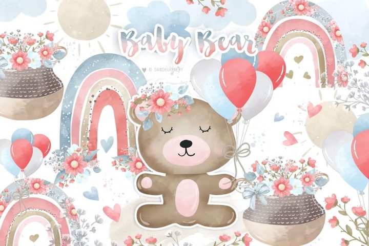 Rainbow, Baby, Bear, Design, Rainbows, Baby, Natural, Color ,Pastel, Sun, Rain, Cloud ,Nursery, Clipart, Flower, gfx