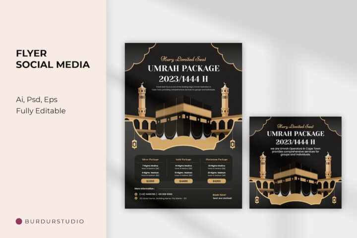 **This template is completely editable to suit your brands colors and corporate fonts. Featuring a central illustration of Mecca’s holy Kabaa. The template is perfect for advertising Hajj & Umrah tour packages. The theme also makes this design useful for other muslim festivals, such as Eid and Ramadan. Instagram post templates are now available, making it easier to share your content and boost your social media presence.