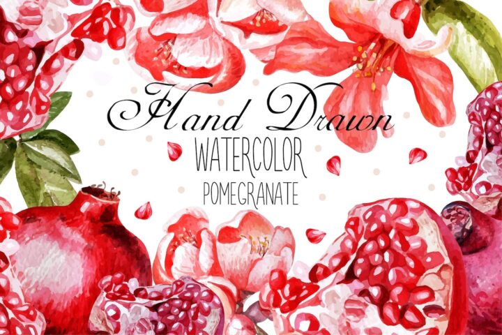 All of the elements you see drawn by hand with watercolors. With beautiful pomegranates, you can create your own design. Postcards, business cards, wedding invitations, be used for web design and printing.