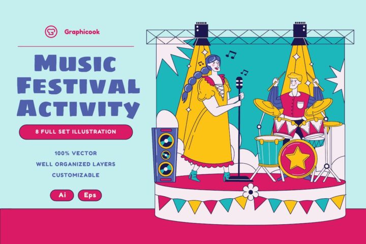 Graphic, Ilustration, Vector, Flat design, Website, Ui, Assets, Clipart, Landing page, Music festival, Music, Guitarist, Drumeer, Vocalist, Graphicook,