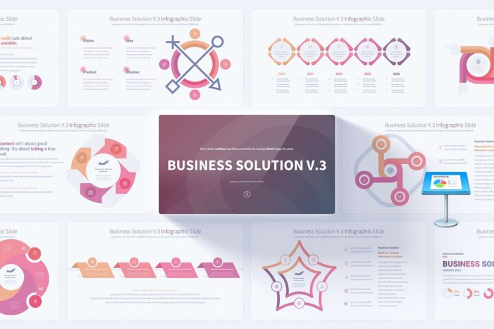 Business Solution V.3 Keynote Infographics Slides have 33 Unique slides / Total 35 slides and it has a lot of features. It’s based on Master Slides witch makes a customization very easy. It comes with 12 colors variations with light background. It is built in with 16:9 Full HD resolution. All presentation included an animated slide and transitions. Easily Editable all Element. Suitable for those who want to show their business in a simple and interesting way. Ideal for a business, solution, digital marketing, strategy business, corporate, goals, personal and professional use etc.