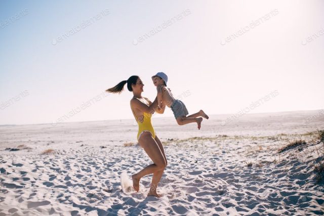 A mother holding a little boy while wrapped in a colourful blanket on the beach