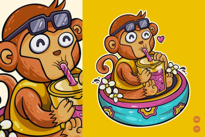 Monkey, Drink, Chill, Animal, Sticker, Illustations, Boba, Sugar, Summer,