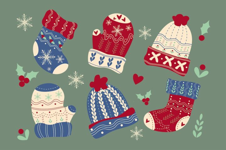 Christmas, Gloves, Socks, Vector, Collection, Mittens, Icons, Woolly, Hats, Cap, Beanie, Woollen, Cozy, Xmas, Newyear,