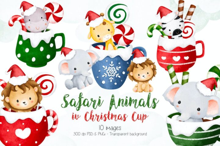 Season, Cartoon, Cute, Watercolor, Illustration, Ornaments, Winter, Animal, Safari, Cup, Mug, Lion, Giraffe, Elephant, Christmas,