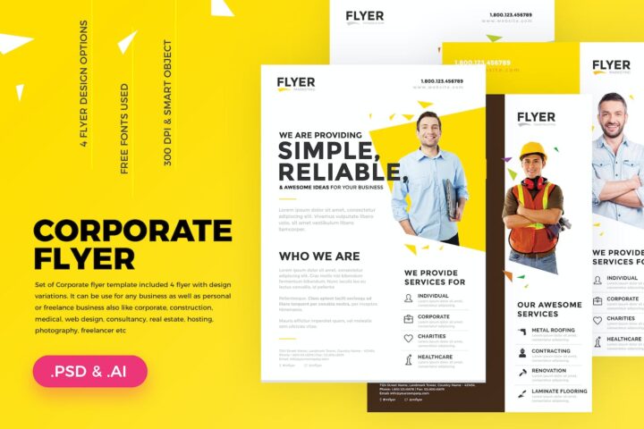 Set of Corporate flyer template included 4 flyer with design variations. It can be use for any business as well as personal or freelance business also like corporate, construction, medical, web design, consultancy, real estate, hosting, photography, freelancer etc. You will get both version PSD & .AI, can edit easily of its fonts, color, images & shapes. Its fully editable flyer in Photoshop & Illustrator.