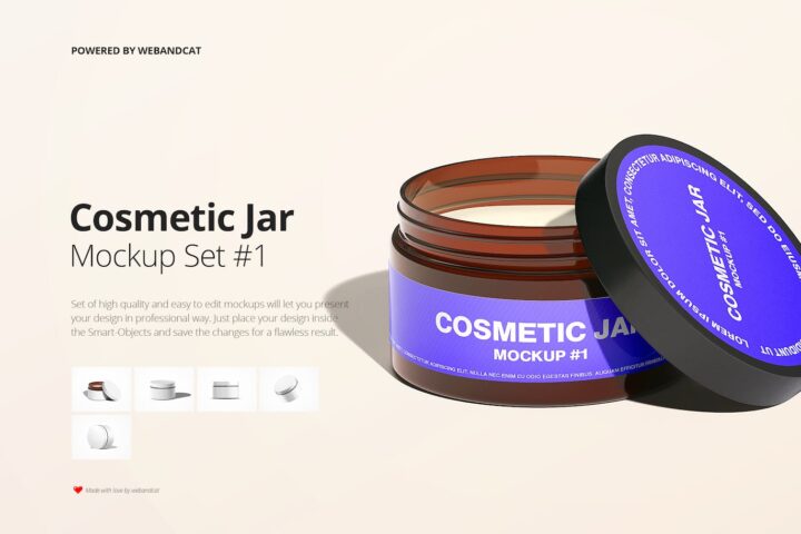 Set of 5 high quality and easy to edit Cosmetics Amber Jar Mockup’s will let you present your cosmetic jar design in professional way. Just place your design inside the smart-object and save the changes for a flawless result.