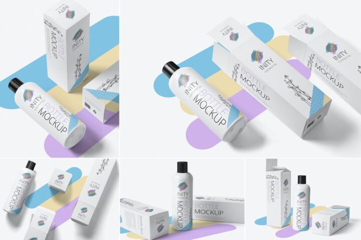 Display your packaging designs realistically using these fully customizable bottle mockups. Featuring smart object option that enables you to change the design of the bottle ad its box with a single click. Furthermore, you can also customize the color of the bottle’s cap, effects and the background of mockups.