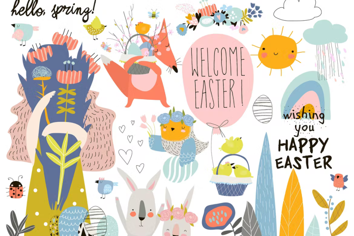Easter, Animals ,Bunny ,Spring ,Egg ,Chick ,Fox ,Girl ,Flower ,Vector, Rainbow ,Owl ,Isolated ,Butterfly ,Set ,gfx