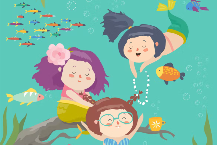 Cartoon ,Mermaid ,Underwater ,Sea ,Friends ,Friendship, Vector ,Castle ,Illustration ,Water ,Character ,Magic, Fish, Seaweed ,Ocean, gfx