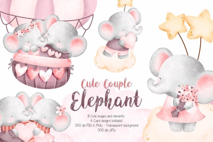 18 Cute images and elements 4 Card designs (editable) 300 dpi PSD & PNG – Transparent background 300 dpi JPG