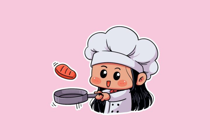 Cute, Cartoon, Character, Chef, Cook, Cooking, Meat, Food, Kitchen, Meal, Restaurant, Steak, Girl, Apron, Pan,