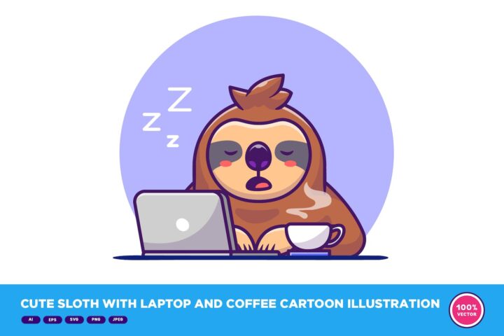Sloth, Sleep, Sleepy, Laptop, Coffee, Animal, Technology, Cute, Vector, Icon, Illustration, Logo, Mascot, Character, Design,