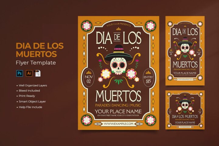 Promote Dia De Los Muertos Flyer Template Set is perfect for promoting Day of The Dead / Dia De Muertos parties and events. All elements are in separate layers and text is editable.