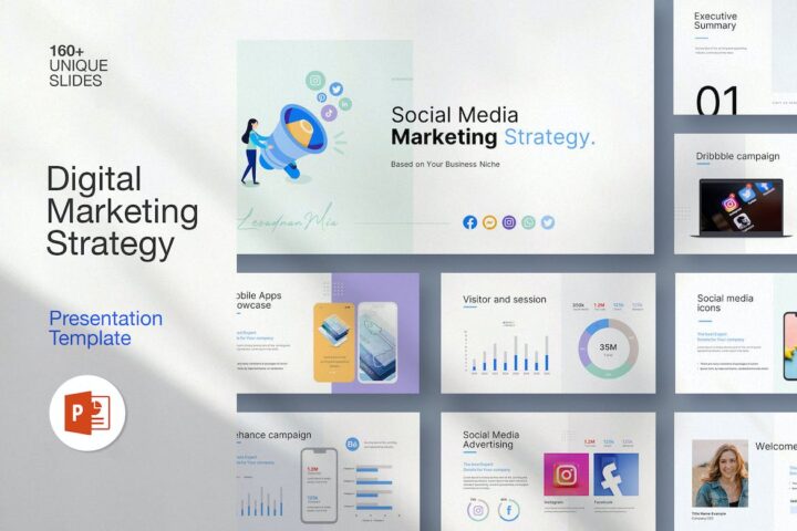 Digital Marketing Strategy Presentation Template / Social Media Marketing you can form a successful digital marketing strategy to reach customers through social networks. This social media strategy powerpoint template contains 109 useful slides for social media strategies and processes such as user analysis, market analysis, targeting, social media plan, marketing strategy, content plan, campaign, schedule, digital marketing KPIs, budget, and many more. —