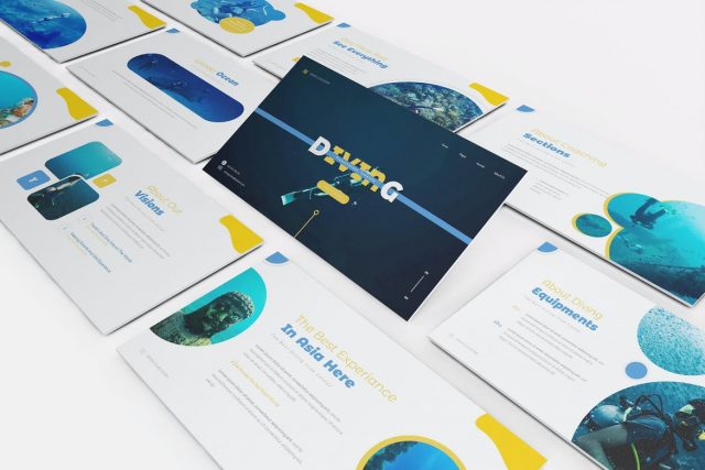 Diving Clubs Powerpoint Template for diving presentation template. With flat and minimalist design make your presentation stand out, with simple, clean, and minimalist design concept. for high quality brand presentation asset.