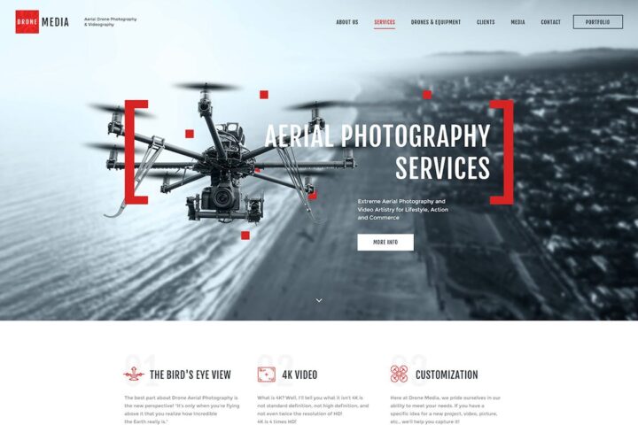 Drone Media is a new, fresh, stylish & trendy WordPress theme. It is focused on aerial photography and videography. The design has modern touch and feel, and it offers full pack of options to describe your services and expose all your projects. It is perfect for those who deal with photo shooting, video recording, event agency with camera operator services. It works for both corporate business & private organization.