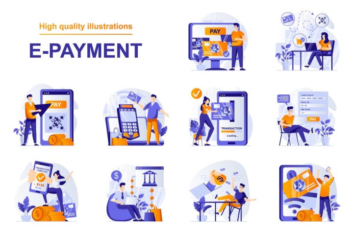 E-payment web concept with people scenes set in flat style. Collection of secure mobile payment with credit card, paying digital receipt in online banking. Vector illustration with character design.
