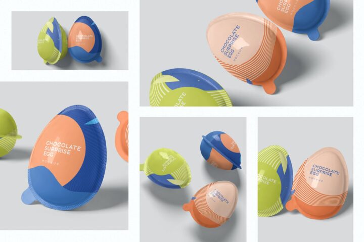 These egg chocolate toy packaging mockups offer egg shaped plastic packaging to show your toy packaging and chocolate egg candy packaging designs. These mockups offer 5 different arrangements and angles to show your product design. Just use smart object option to add your designs with a single click. You can also use its well-named layers for the personalization of shadows, light effects, colors and background.