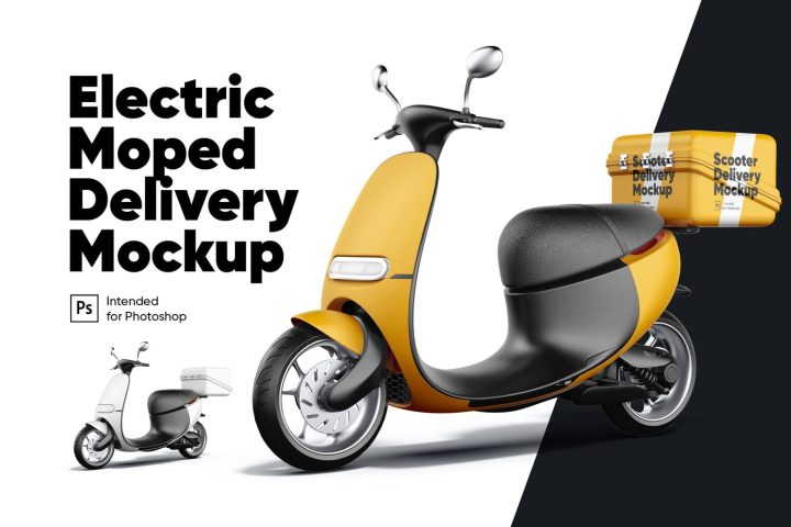 Create an elegant presentation for your designs with this fully customizable Electric Moped Delivery Mockup Includes smart-objects and masks, allowing you easily add your design and lets you change the color for most scene objects.
