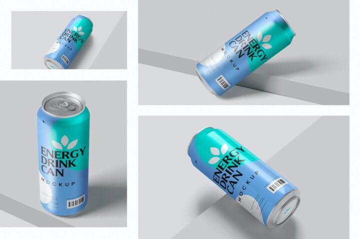 4 different energy drink can mockups to showcase your packaging designs on slim tin cans. Featuring smart object option to help you replace your design with a few clicks. These can mockups come with customizable background so you can change the background easily with your choice. In addition to this, you can also adjust the light effects and shadows using well-named layers.
