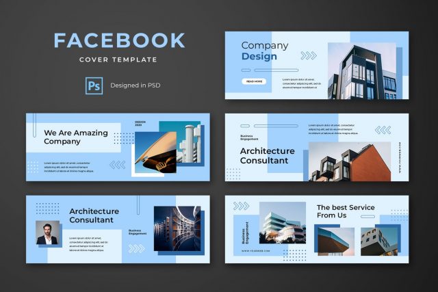 Creative Facebook Cover Template Architecture suitable for social media website promotions, covers the categories of Business, Blog, Fashion, Shop, and Magazine.