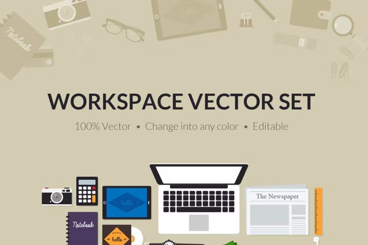 Flat Creative Workspace Tools – you can use this item for you hero image, banner, poster, etc. never worries about the resolution, this file 100% vector you can resize each object into any size.