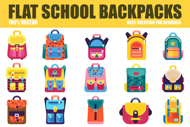 Flat school backpacks supplies set icons. Education and study back to school, schoolbag luggage, rucksack. Vector illustration.