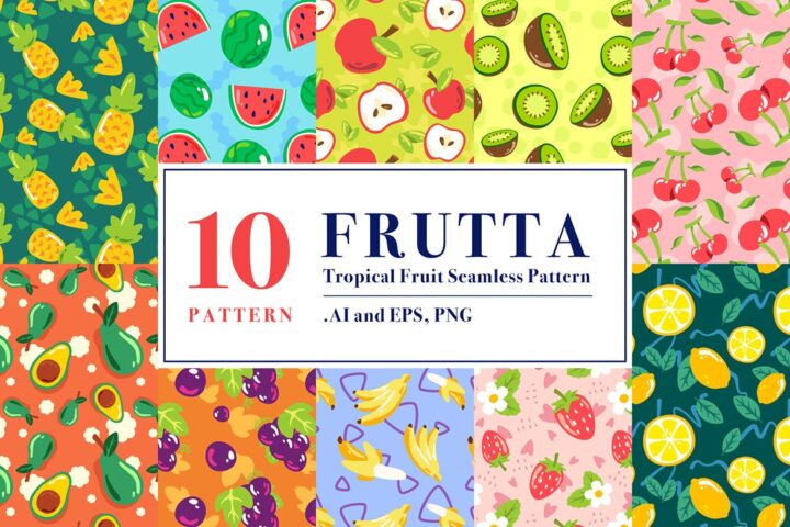 Inspired by tropical fruit patterns found all around us…from Lemon, Strawberry, Banana, Grape, Avocado, Apple, Kiwi, Leccy, Watermelon, Pineapple. This beautiful set of patterns are ideal as backgrounds for any print material, Packaging projects, Fashion projects, Online Blogs, crafts, Branding projects and so much more! And they can be scaled up with no loss in quality!