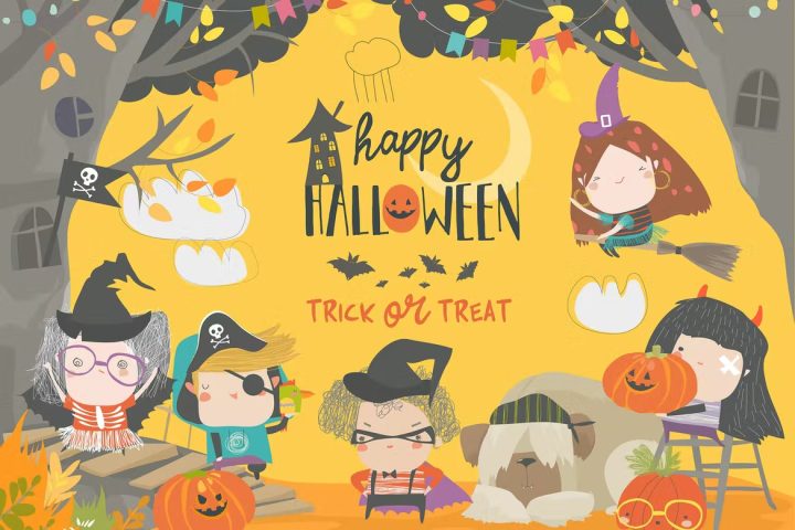 Halloween, Kids, Pumpkin, Vector, Holiday, Festive, Witch, Party, Dress ,Devil, Spooky, Tradition, Costume, Black, Celebration, gfx