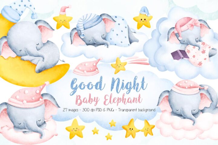 Good Night baby Elephant You’ will receive: 27 Images 300 dpi PSD & PNG Transparent background.