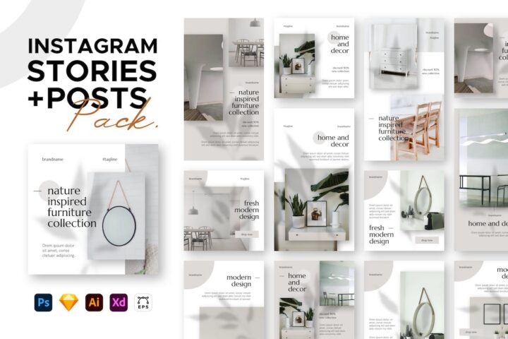 Instagram Stories + Posts Template Pack (Social Media Kit) is a pack of social media design templates that can be used for Furniture Business, Architect, Decoration, Interior, Agency, Studio, Blogger, Personal Trainer, Celebgram, Speaker, Public Figure, Artist. Template design on square size for any social media such as Instagram post, Promo, Sale, Blog post or Pinterest post, available in Sketch, PSD (Photoshop), and AI (Illustrator).