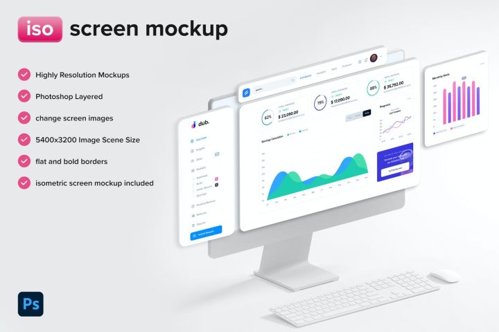 This mockup template includes 2 version of a screen mockup with different screens on top. Perfect for portfolio shots, socialmedia posts, or really anywhere you need simple, clean, and stylish looking presentations.You can mix-and-match different objects in Adobe Photoshop to create your own scenes and simply apply your UI designs using the Mockup plug-in or fully modify the scenes. Isomockups come with screen placeholders out of the box to make it super quick to place your image on the perspective screen. Pure vector-based backgrounds that allow complete customization for the shape and colors. The product contains one PSD file with pre-made isometric object to create a custom scene and 2 additional pre-made isometric scenes to start your UI or web project.