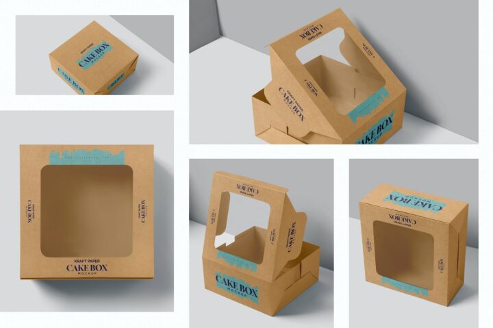 These wide and high square shaped kraft paper cake window box mockups will help you showcase your bakery packaging and branding designs. These mockups have smart object option to help you add separate designs on each visible side of the cake box. You can also adjust the light effects and shadows with your choice. In addition to this, you can also change the background depending on your design requirement.