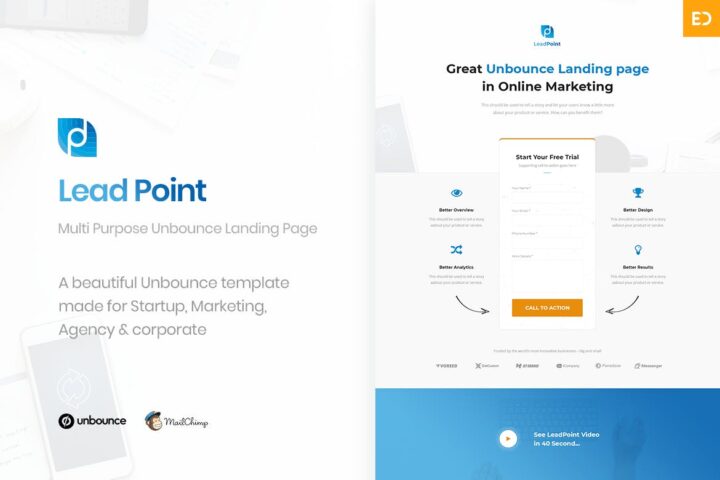 LeadPoint is a clean and modern Unbounce Template with focus on conversion, it can be used to promote your services, or even in any lead gen or click-through campaign. Source PSD’s are included for easy edition and customization. We hope you like it!