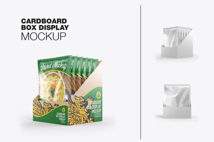 Metallic, Sachets, Display, Box, Mockup, Packaging, Product, Branding, Advertising, Marketing, Pouches, Presentation, Showcase, Food, Products,