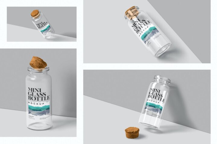 Versatile mini glass bottle with cork mockups to help you in your glass bottle branding project. You can easily use smart object option to show your designs. You can also customize the shadows, effects, background and colors using well-named layers. These mockups are best to showcase your liquid bottle, cream bottle and salt bottle packaging design.