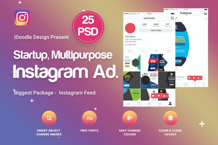 Multipurpose, Business, Startup Instagram Banners Ad PSD Template is a clean and unique design so far using the latest trendy material design for introductions company, promotions, marketing, make money online…