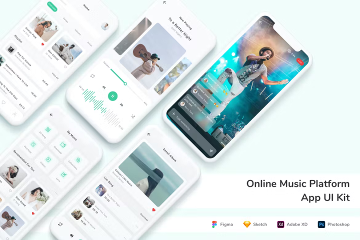 Online Music Platform App UI Kit is designed with modern design trends.