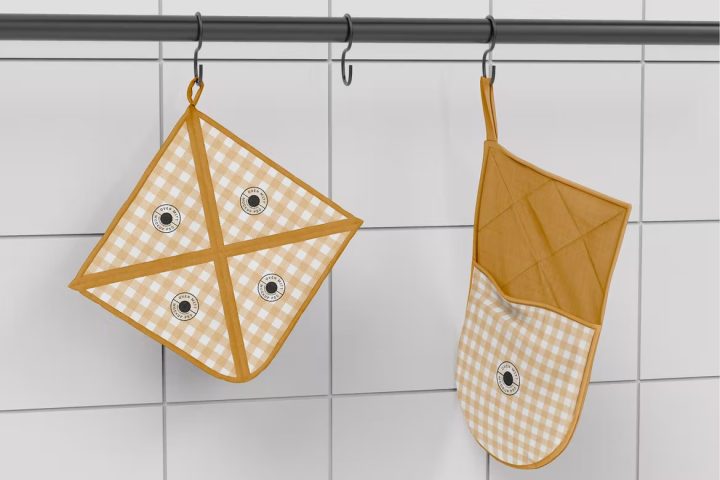 Oven Mitt and PotHolder Hanged from Bar in Kitchen