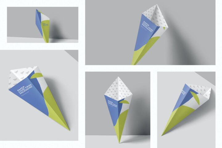 These paper cone packaging mockups are great to showcase your food packaging designs. You can use these to present your French fries packaging designs. These mockups offer smart object option and layers for the customization of design, shadows and light effects and background. Just use Photoshop to use these tools and make amazing presentations of your packaging designs.