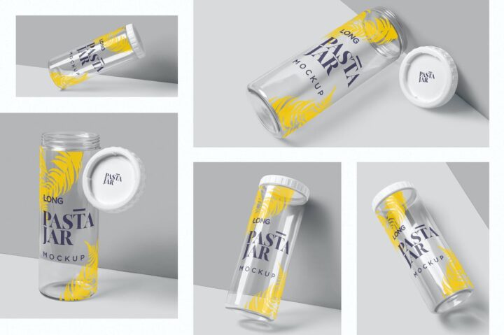 Present your food packaging designs in a pleasant way using these awesome pasta jar mockups. This mockup set has long transparent jar with a plastic cap to show off your packaging and branding designs. You can take benefit of smart object option and well-named layers to customize the design, colors, shadows, effects and background.