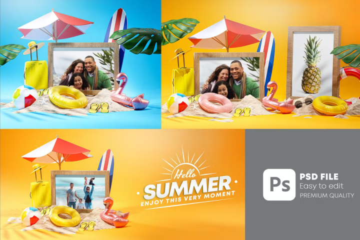 Photo, Frame ,Summer, Mockup ,Pack, Beach, Tropical, 3d, Cute, Accessories ,Sand, Umbrella, Swim ,Travel ,Holiday, gfx