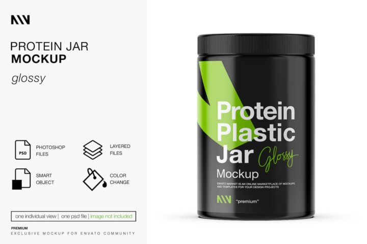 Present your design with this “Protein Plastic Jar” mockup befrore printing. The file includes seperate layers for the color objects and background. Smart layer for the label helps to apply your design. Premium quality and simle to use.