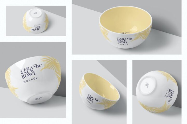 Clean and beautiful round ceramic bowl mockups to help you display your artwork, graphics and dishware designs. You can use smart object option to show your design on this porcelain material round bowl. These mockups have 5 different styles to show your bowl branding designs. Not only this, you can also customize the light effects, shadows and background.