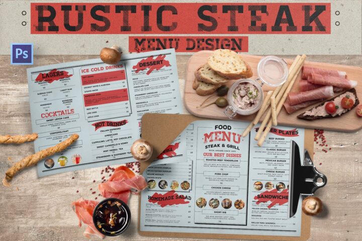 This food menu comes with front & back design that you can easily edit. There are 2 color palettes: one with casual brown paper texture, and one with changeable background color, so you can decide which one matches your business well.