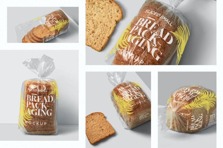 Have these sliced small bread packaging mockups with transparent polythene packaging to showcase your bakery packaging designs. Offering smart object option and well-named layers for the customization of design, light effects and shadows. You can also change the background of the mockups with your choice.